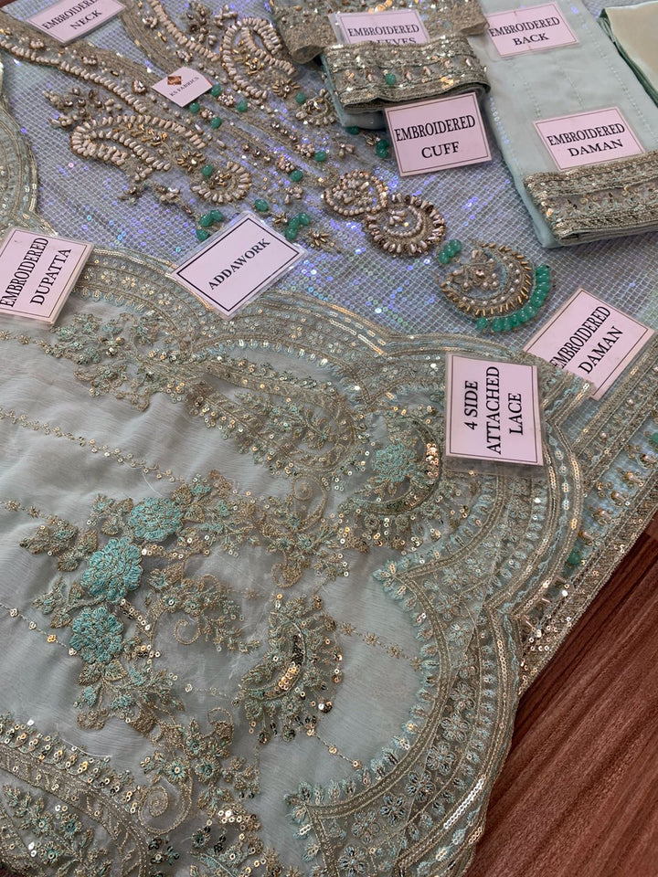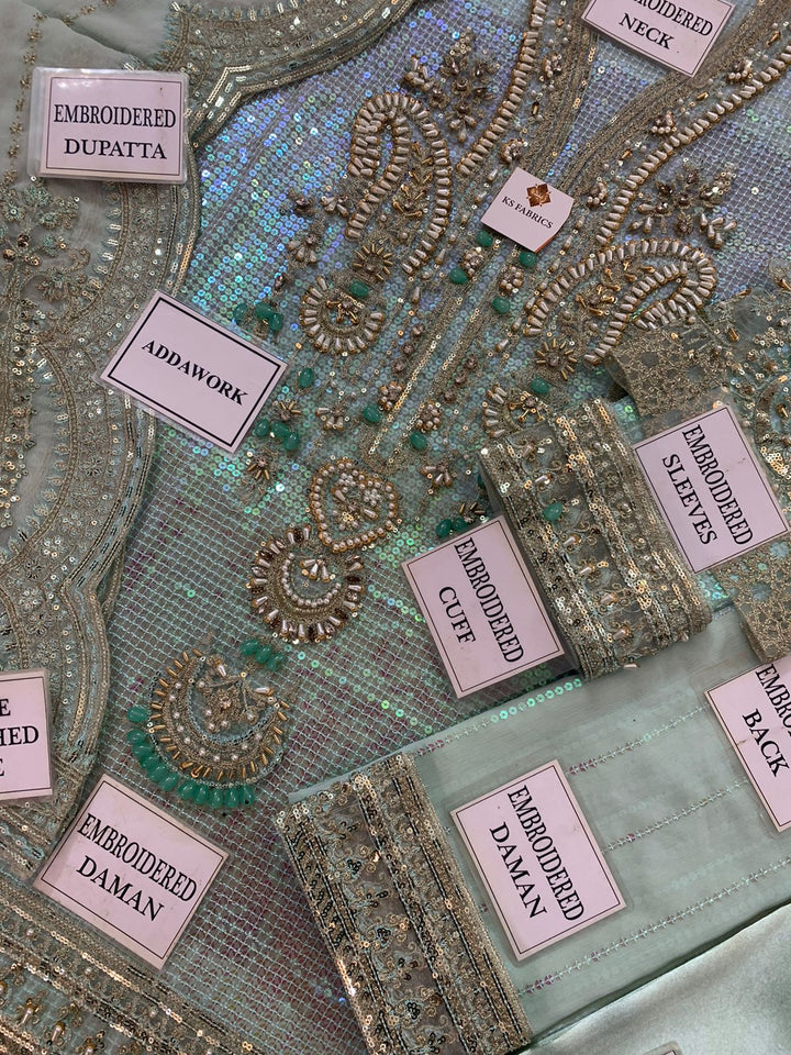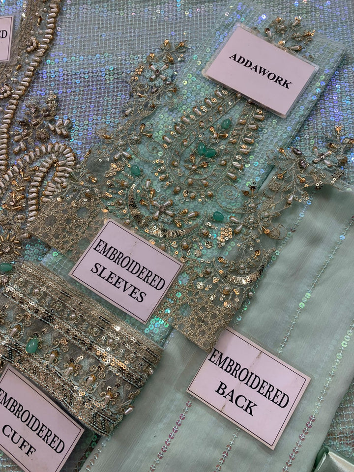 Heavy Embroidered with 5MM Sequence Bamber Chiffon Front and Embroidered Neck Patch Embellished with Adda Work also Heavy Embroidered Daman Patch Embellished with Adda Work