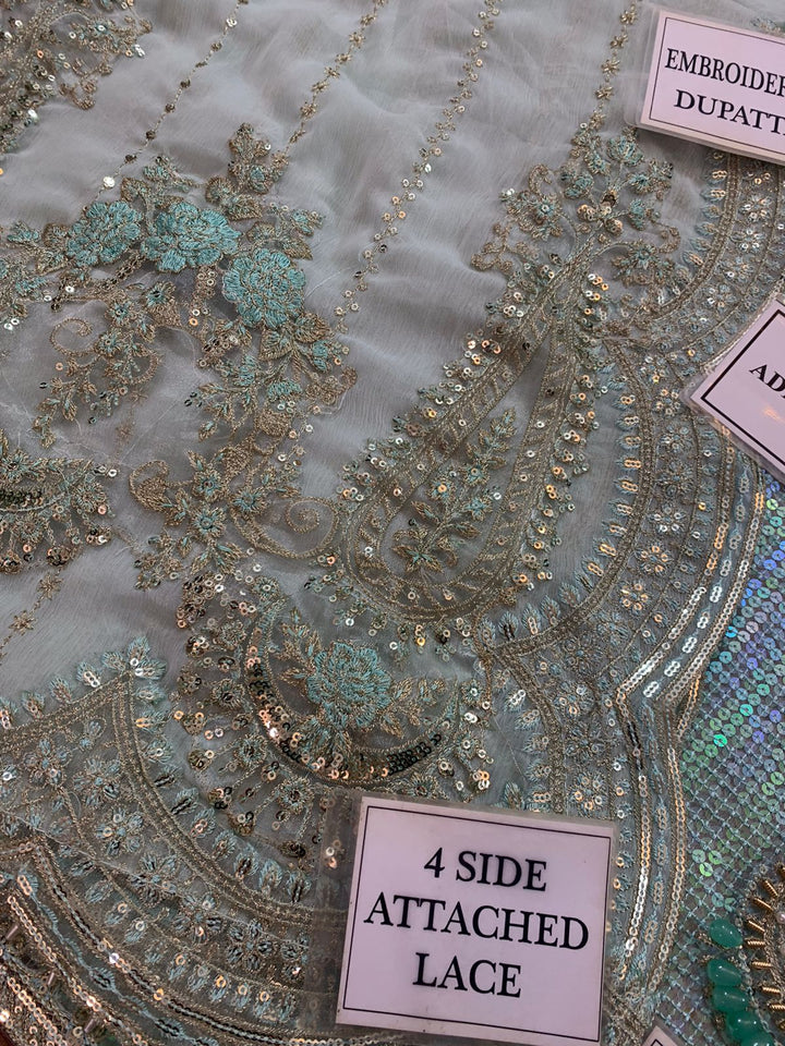 Ready To Wear Fully Heavy Embroidered With 5Mm Sequence Bamber Chiffon Dupatta With 4-Side Embroidered Attached Lace Along With Embroidered Pallu Patch Attached